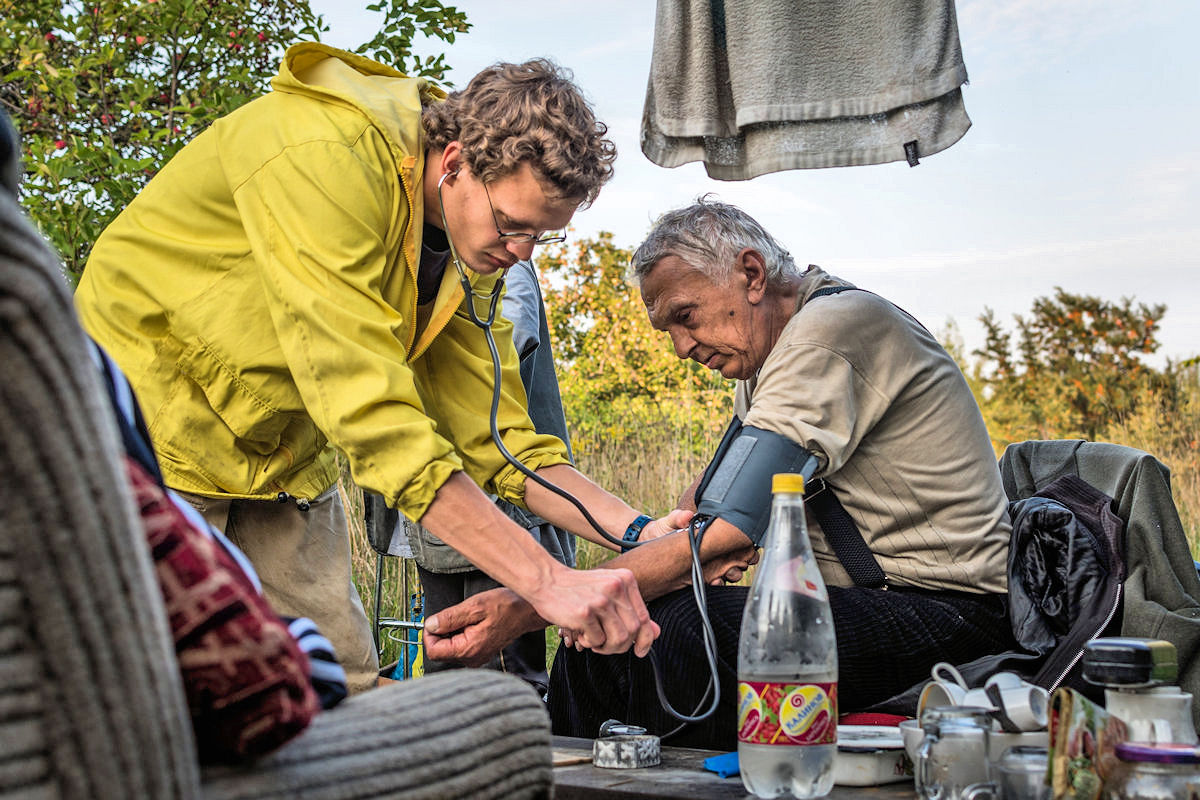 En quatre ans, nous sommes passés d’une chaise pliante et d’une trousse de 1er secours à un cabinet médical sur roulettes, un bus, nous raconte Sergey Levkov, le fondateur de Charity Hospital.