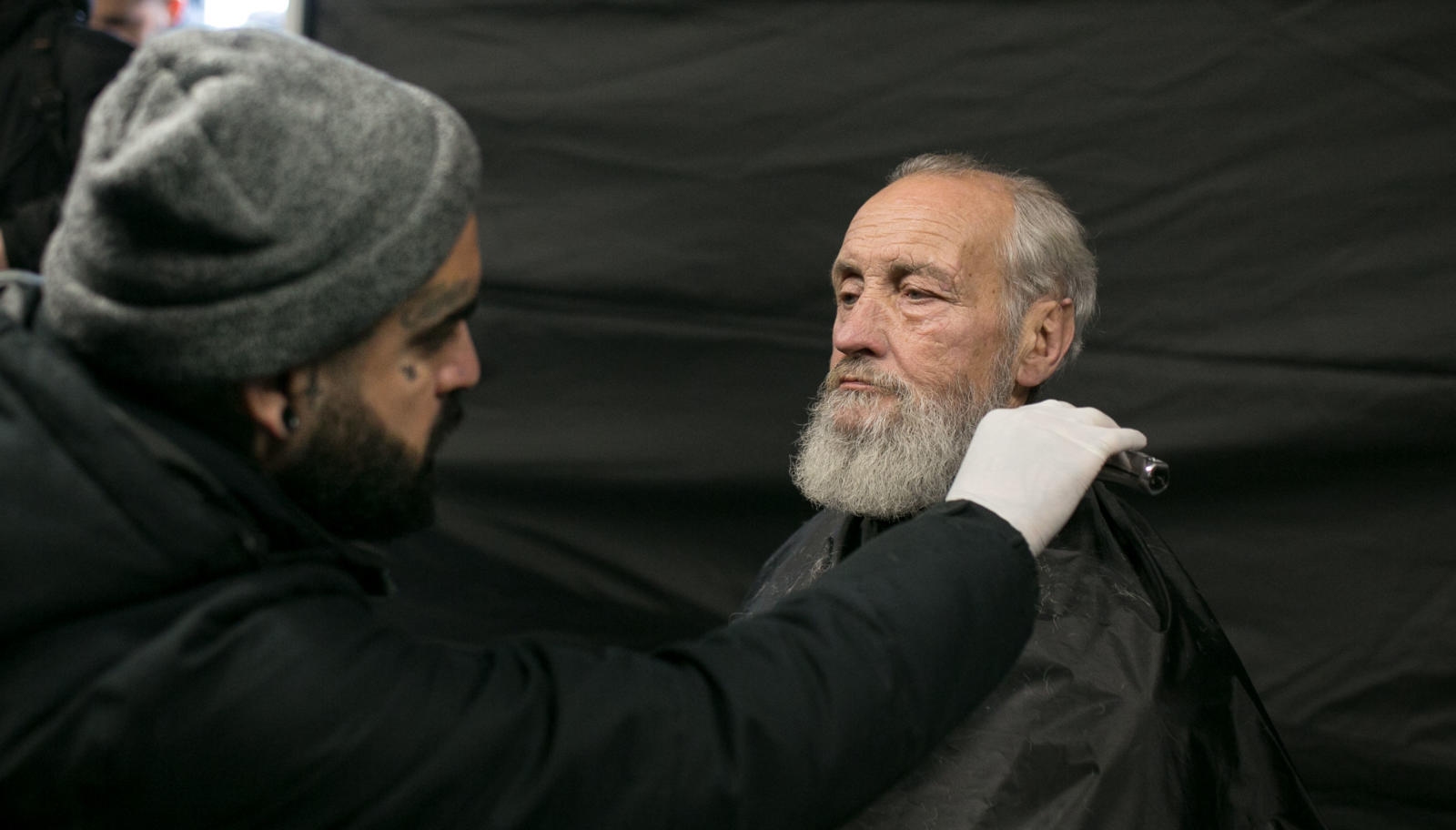 Dans la cour de Nochlezhka, à côté d’une des Tentes de la Survie, Nasir Sobhani accompagné de quelques assistant bénévoles à posé sur ses tréteaux, ciseaux, brosses, peignes, rasoirs afin de coiffer les sans-abris de passage venu là se réfugier du froid.