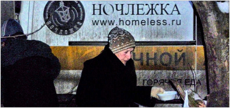 Créée en 2002 par Nochlezhka, cette tournée caritative quotidienne, unique à Saint-Pétersbourg, permet d’offrir à cent cinquante personnes de la nourriture et des boissons chaudes, des soins de première urgence et une indispensable présence humaine. Quatre volontaires assurent la tournée de distribution et deux fois par semaine, un médecin les accompagne afin de changer les pansements, de répartir des médicaments.