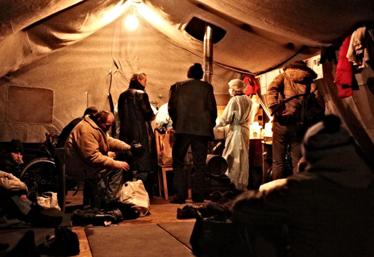 Ses bronches sifflent comme une locomotive, il doit avoir une bronchopneumonie s’exclame Sacha. Les deux médecins de Charity hospital examinent Youri, l’un des sans-abris réfugiés cette nuit dans la Tente de la Survie.
