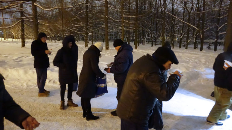 A l’approche de l’arrêt Yuzhnoe shosse, loin de tout, dans une ruelle où la neige est grise, une bonne quinzaine de sans-abris nous attendent.
