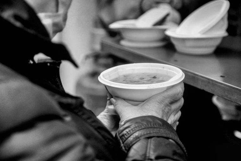 Die obdachlosen Sans-Papiers nehmen der Reihe nach ihren Teller Suppe und ihr Stück Brot. Die Männer essen in der Nähe des Busses, nebeneinander, auch wenn sie sich nicht kennen. Die Frauen wählen hellere Plätze, näher bei den Freiwilligen, ein Moment des Friedens.