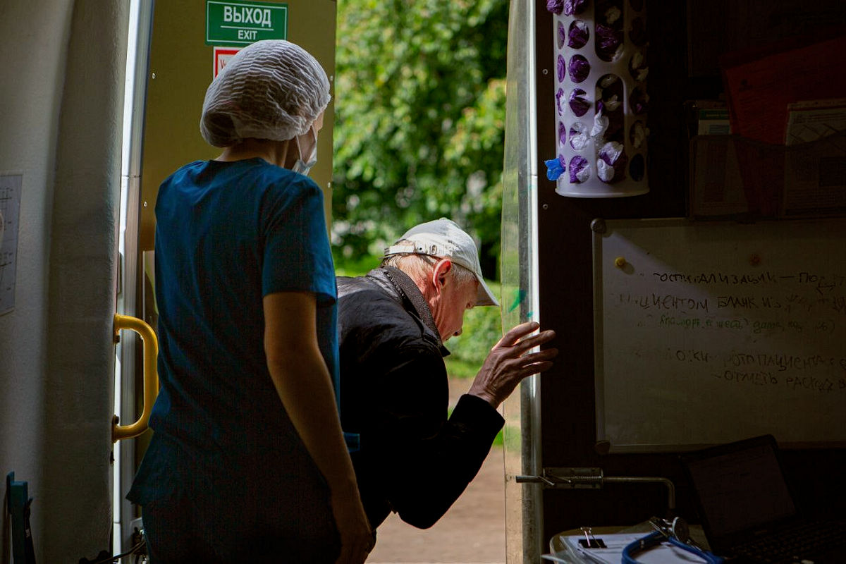 Tout en auscultant Vladimir Sergeevich, ils nous expliquent que les brûlures d’estomac et les douleurs gastriques dans l’abdomen sont une plainte récurrente chez les sans-papiers sans-abris.