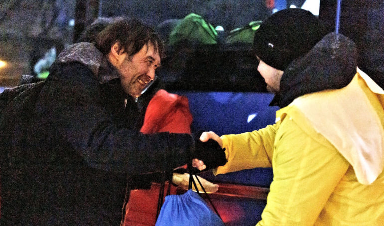 Depuis 2016, Nochlechka procède à une distribution d’étrennes. Il est fondamental, de montrer aux sans-papiers sans-abris qu’on ne les oublie pas, qu’eux aussi ont droit de croire à Ded Moroz, le grand-père gel comme l’appellent les Russes.