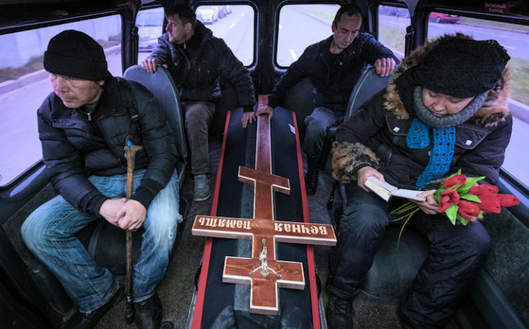 Man lädt den Sarg auf und alle drängen sich in den Lieferwagen.