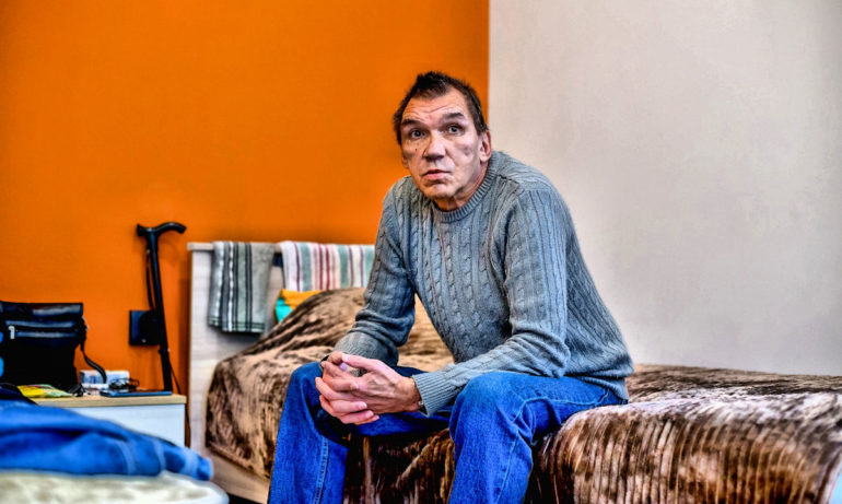 Alexander Alexandrowitsch, obdachlos, papierlos, und infolge eines schlecht behandelten Hüftbruchs gehbehindert, ist der erste, der in unser ganz neu errichtetes Aufnahmezentrum für papierlose, ältere und behinderte Obdachlose einzieht.