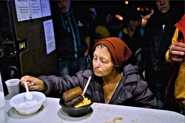 Tard dans la soirée, nous sommes arrivés à l’arrêt proche de station de métro Primorskaya. Des gens, à peine visibles au loin, comme de minuscules points, ont progressivement pris forme, se transformant en de grandes figures sur fond de lumière orange, chaude et vive des réverbères. Une forte odeur de fumée flotte dans l’air, elle se mêle aux exhalaisons du quartier. Nous attendent, des femmes, des hommes, sans abri et pauvres.