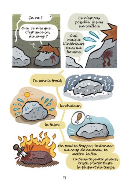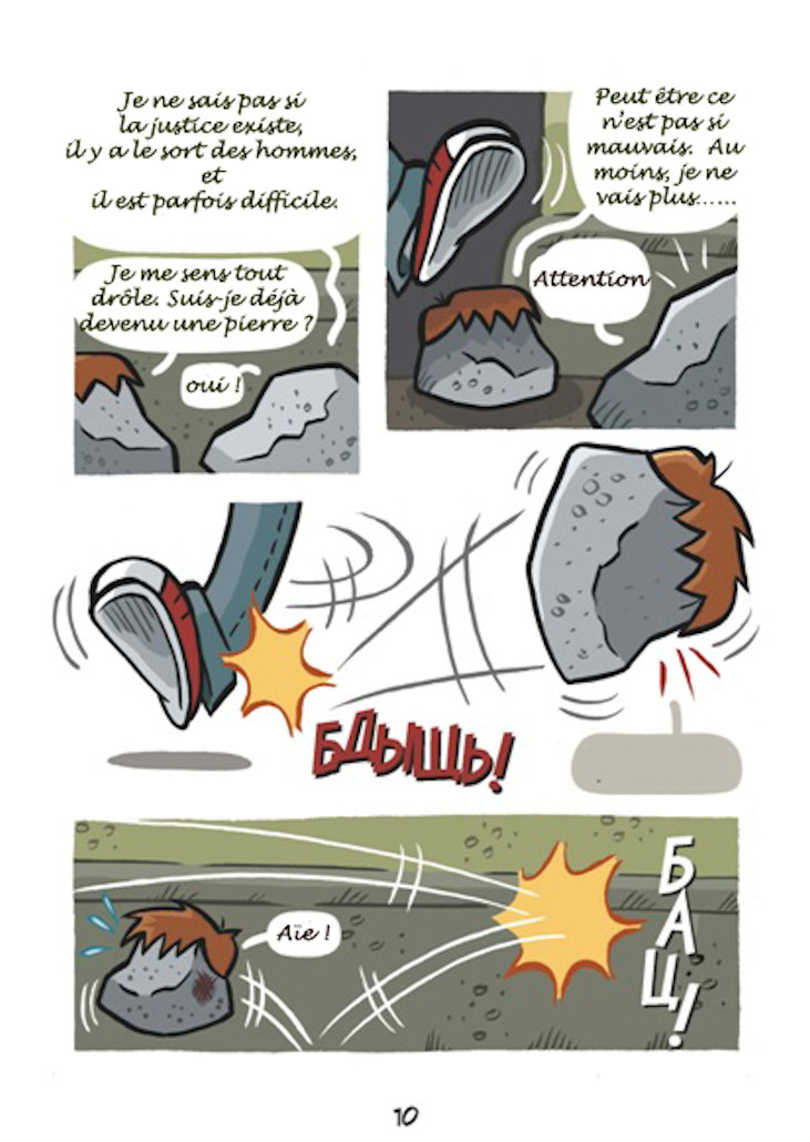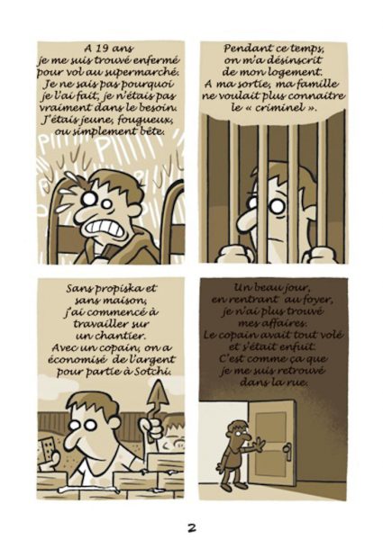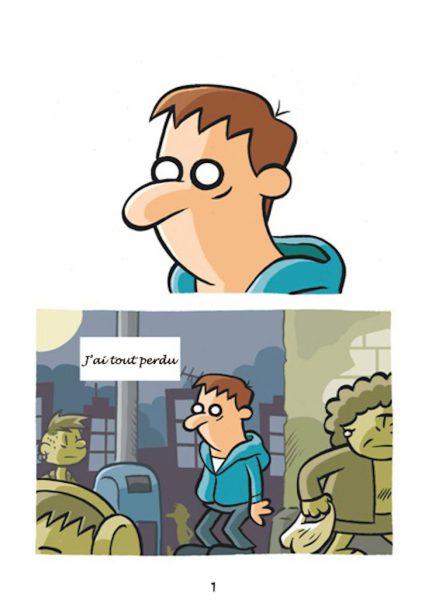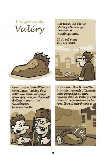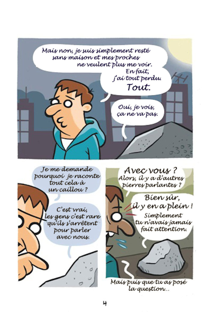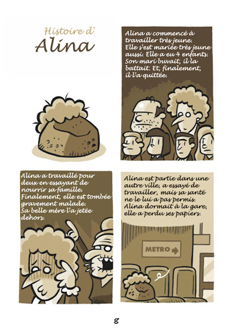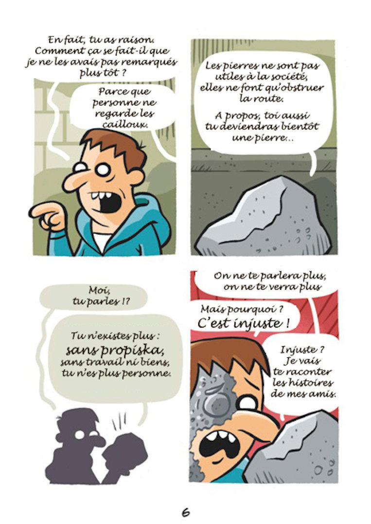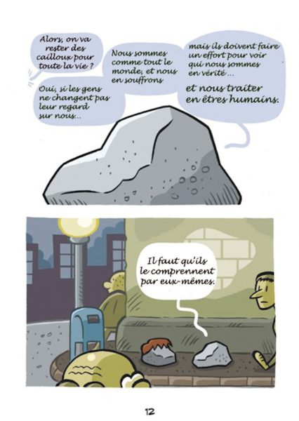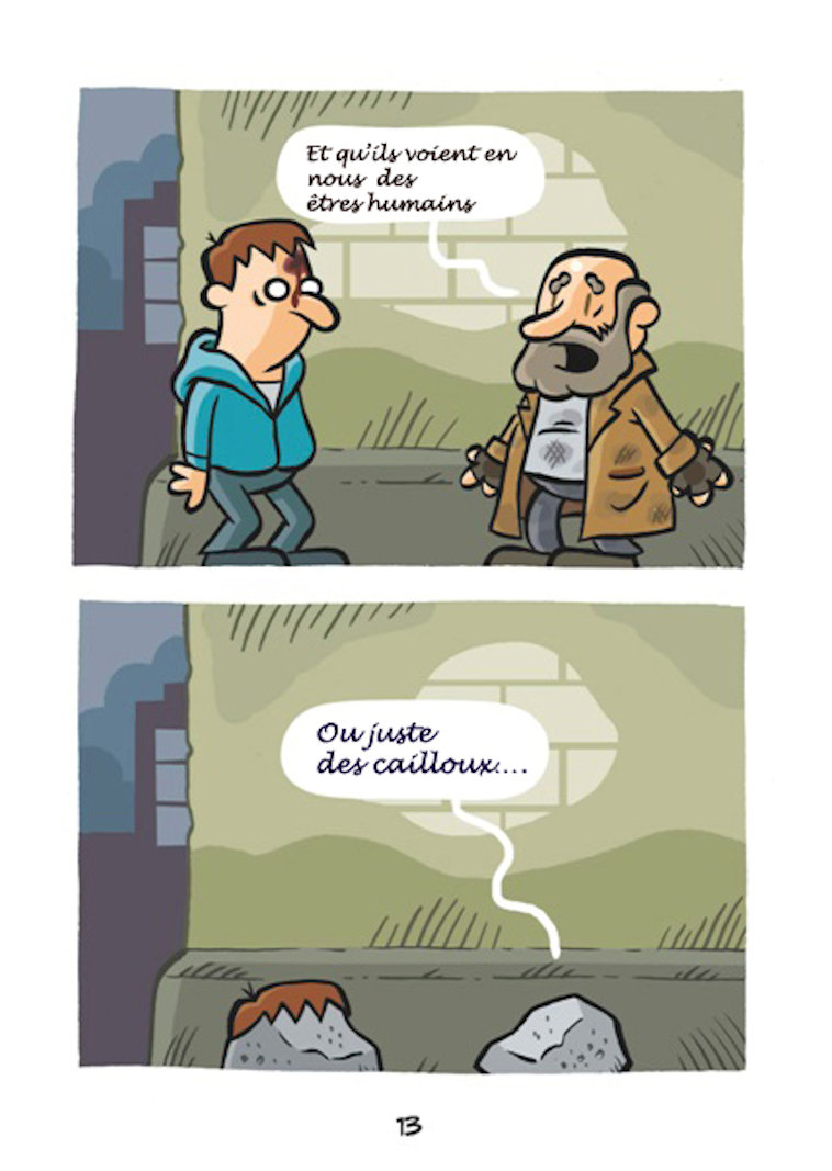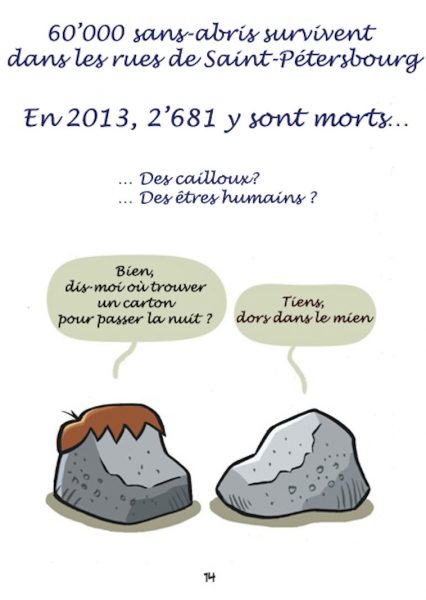 Sur la base d’histoires réelles arrivées à des personnes prises en charge par Nochlechka, le peintre espagnol Ruben Fdez a créé une bande dessinée, « Les Cailloux » peignant cette réalité qui peut arriver à tout un chacun, devenir sans-papier.