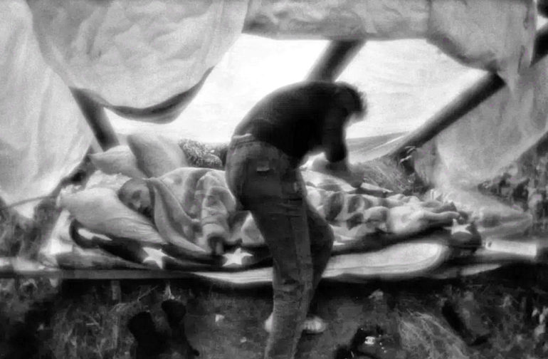 Dimitri, 42 ans, sa femme Larisa, 57 ans, subsistent dans une maison fantôme, sans toit, ni murs : un cadre de porte branlant sans porte, une armoire au miroir fêlé. Au centre, à même le macadam, un semblant d’âtre et sur un des invisibles côtés, une bâche de plastique, illusoire protection, elle délimite une chambrette fictionnelle où, sur le sol, un large matelas suranné et quelques couvertures effilochées officient de lit.