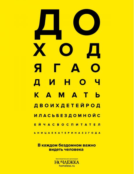 Nochlechka lanciert eine neue Sensibilisierungs-Kampagne. Auf Plakaten wird die Geschichte obdachloser Bürger ohne Ausweise in Form von Schildern beim Ophtalmologen gezeigt.