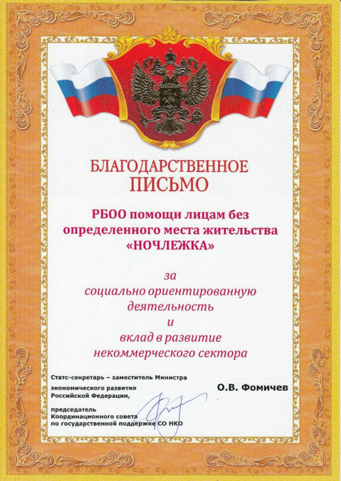 Im Dezember 2013 hat Nochlezhka den Goldenen Standard erhalten. Dieser Preis zeichnet Nochlechkas Buchhaltung als die beste aller russischer Nichtregierungs-Organisationen aus.