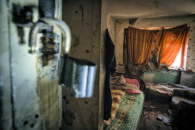 Nastya und Karina untersuchen sie, Sergey und Karim schauen sich um: wieviele Leute leben hier, welcher sanitäre Bedarf besteht, was können sie machen?