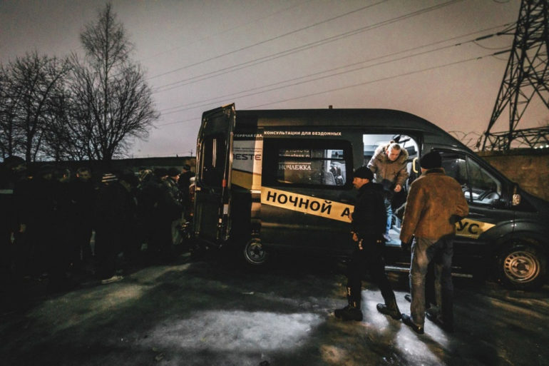 Ils ? Les citoyens russes sans-papiers sans-abris de Saint-Pétersbourg qui, pour les plus chanceux, reçoivent la visite du véhicule de Nochlechka.