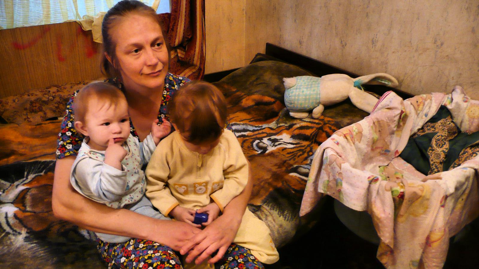 Heute lebt Veronika mit ihren Kindern in einer kleinen 15m2 – Wohung, in der es kaum genügend Platz hat für das Ehebett, das Nachttischchen, das Kinderbett, den Fernseher, das Schränkchen für Lebensmittel, ein paar Stühle, ein Heizgerät und ein wenig Spielraum für Olga und Nastja.